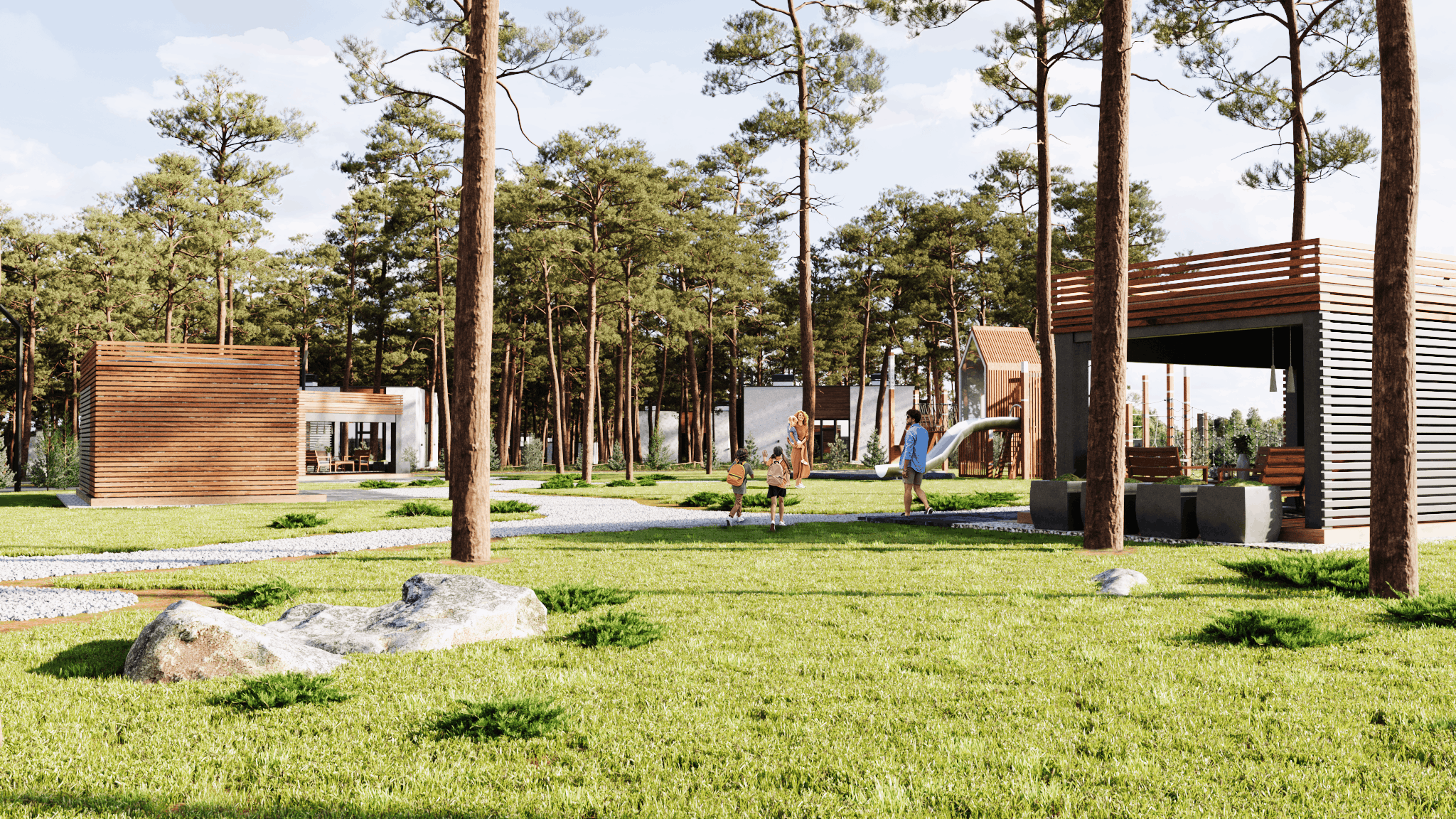 1200 гектар соснового леса. Каждый участок — это не просто земля, а ваш личный лес. Есть и общее пространство — ухоженное, продуманное, живое. Вдоль дорог — видеонаблюдение, так что даже если дети гуляют одни, вы всегда знаете, что они под присмотром. Система пожаротушения защищает ваш дом и лес от любой случайности.
