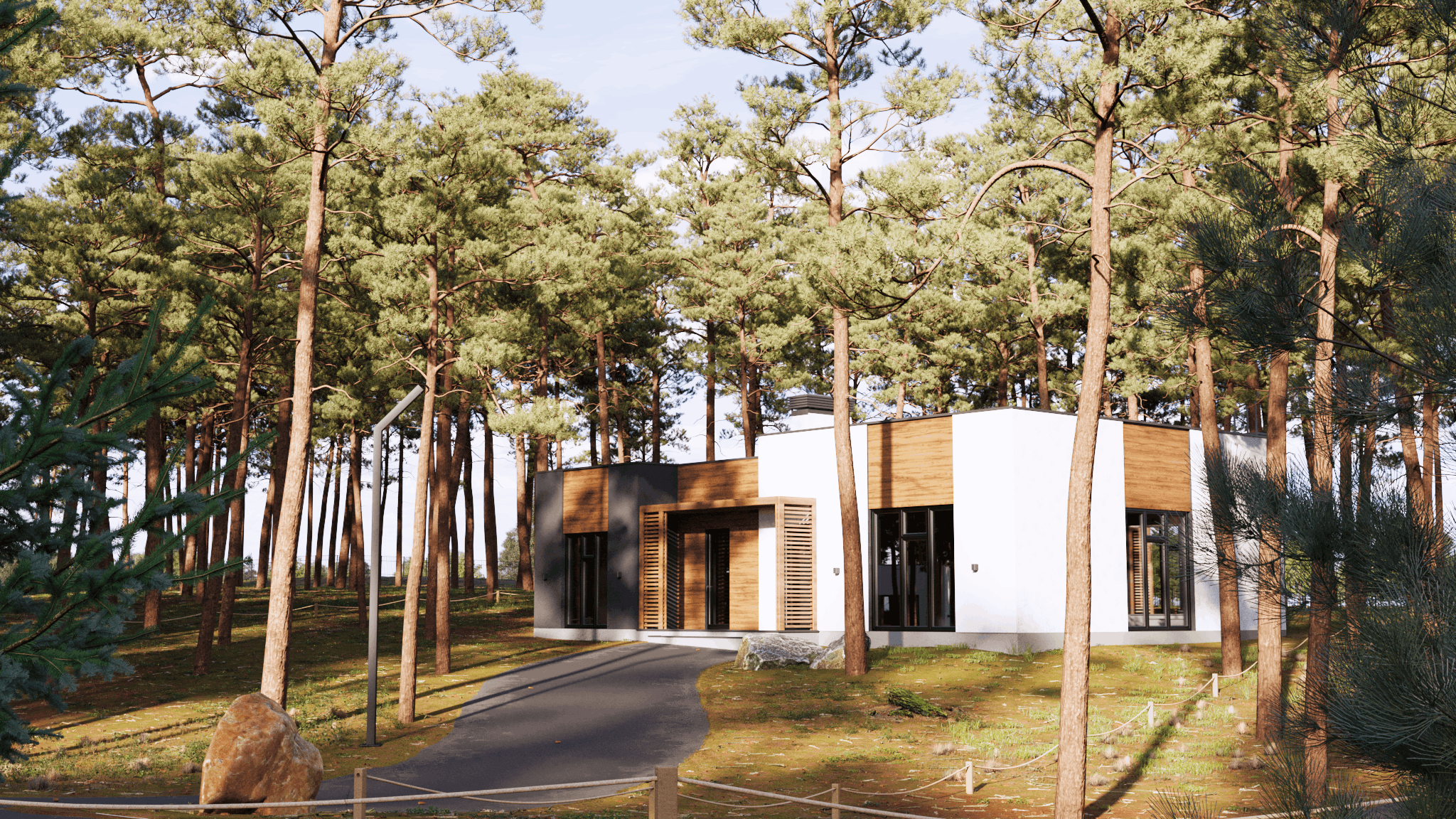 Вы заходите на свой участок. Здесь ваш собственный лес — сосны, которые стали частью вашего сада. А в центре — ваш дом, построенный по проверенным технологиям: компания строит с 2007 года и отвечает за качество. Гарантия — 5 лет, согласно закону, а система контроля качества включает отдел планирования, прораба, начальника участка и даже основателя компании.