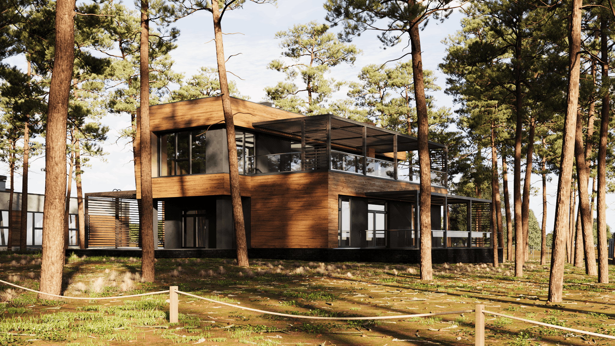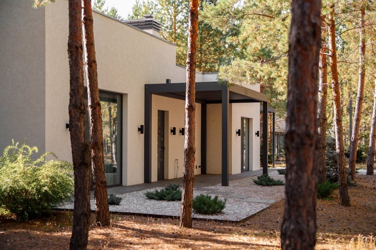 Вы подходите к панорамному окну. Перед вами — лес. Не просто деревья за забором, а настоящий сосновый бор, который начинается прямо у вашего дома. Солнечные лучи пробиваются сквозь пушистые лапы, ветер чуть слышно шелестит кронами, где-то вдалеке поет птица. Вы открываете створку, и комната наполняется свежим, смолистым воздухом.